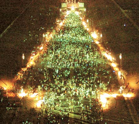 在臺(tái)灣省高雄市夢(mèng)時(shí)代廣場(chǎng)旁的時(shí)代大道上,一場(chǎng)“萬(wàn)輪壓馬路、排棵圣誕樹(shù)”活動(dòng)正在舉行。只見(jiàn)五萬(wàn)人騎自行車或踩直排輪游行后,在時(shí)代大道上聚集排出一棵長(zhǎng)兩百米、寬八十米號(hào)稱世界最大的圣誕樹(shù),場(chǎng)面相當(dāng)壯觀。臺(tái)灣《中國(guó)時(shí)報(bào)》圖