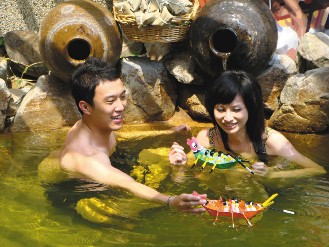 昨天推出的“雄黃酒湯”,在溫泉里加入適量的雄黃酒。據介紹,雄黃酒含有三硫化砷,不可多喝,但用來泡澡凈身,可以消除疫病,溫泉池畔放了一壺雄黃酒,游客還可以沿襲傳統,用手指或毛筆沾酒,在額頭寫一個“王”字,體驗古代人驅邪的儀式。