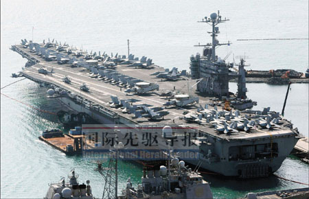 國際先驅(qū)導(dǎo)報(bào)特約撰稿海韜發(fā)自北京 “遲到”了近兩個(gè)月的美軍“華盛頓”號(hào)核動(dòng)力航空母艦,9月25日終于緩緩駛?cè)胄履父廴毡緳M須賀軍港。但僅僅6天之后,它就匆忙趕往韓國釜山,參加海上閱兵式;隨后,它還將南下東南亞,并于11月折回日本,主持美日海上聯(lián)合軍演。