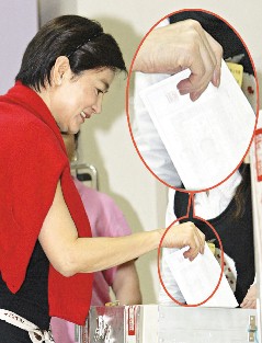 中新網3月25日電 據香港明報報道,臺灣著名藝人林青霞日前遠從香港返臺投票,結果被傳媒發現,她在投票時,用私章而不是法定的投票印章蓋在選票上,成了廢票,而她的好友兼老師、作家龍應臺竟也是如此,昨日龍應臺接受訪問時自嘲是“大傻瓜”。