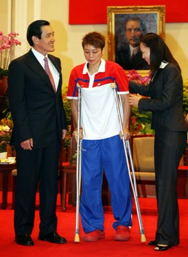 馬英九接見中華臺北奧運代表團,與受傷的跆拳道選手蘇麗文(中)合影。(“中央社”圖)