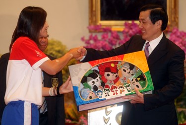 中華臺北奧運代表團掌旗官賴圣蓉(左)贈送奧運福娃給馬英九。(“中央社”圖)