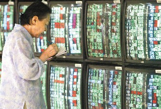 臺北股市再跌,號子里一位投資人觀察大盤與個股的變化,并仔細的做筆記。 (圖片來源:臺灣《聯合報》)