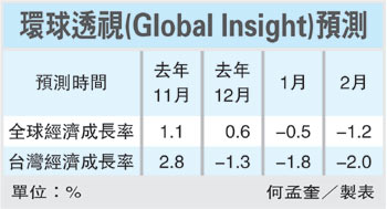 中新網2月18日電 臺灣《經濟日報》18日頭條新聞報道說,環球透視(Global Insight)剛發布最新經濟預測,再度下修臺灣今年經濟成長率,并下修到負成長2.0%,甚至比全球經濟負成長1.2%還差。