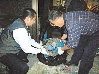 警方押解吳嫌到租屋處挖出水泥塊,鉆開水泥塊后,尸臭四溢。