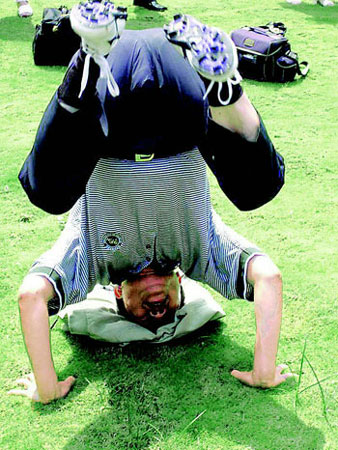 謝長廷“漏網鏡頭”:臉涂迷彩 大玩倒立(組圖)(2)