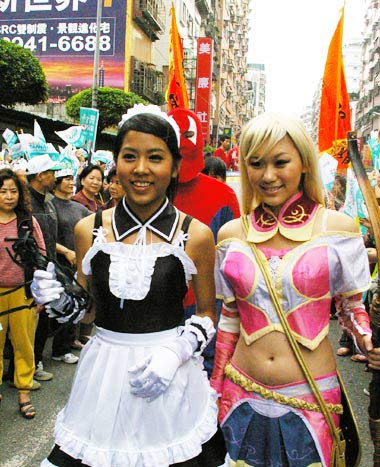 民進黨游行隊伍中,有年輕辣妹打扮成女仆等裝扮,吸引路人眼光。