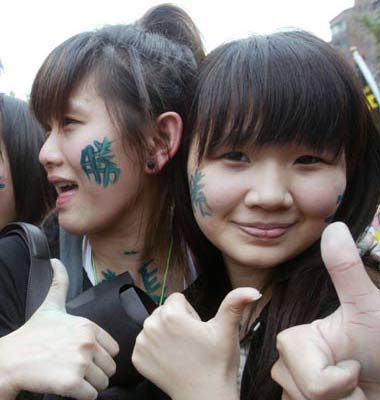 民進黨活動上參加活動年輕人在臉上寫“勝”字挺謝長廷。 聯(lián)合報圖
