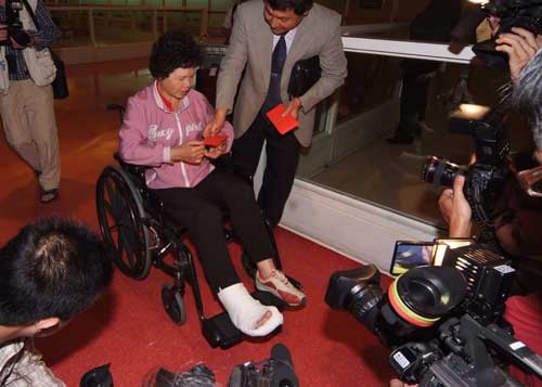 臺中乾隆旅行社團員在四川發生強震時,遭落石擊中腳踝,十五日凌晨坐輪椅返臺,所幸沒有生命危險,旅行社也送上紅包。(“中央社”圖)