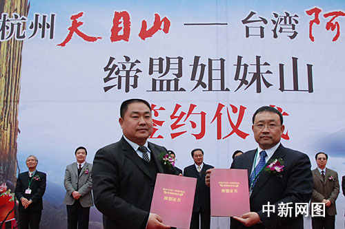 中新網杭州2月24日電(記者 龔讀法 實習生 姜越潮)即杭州靈隱寺與臺灣中臺禪寺結盟之后,杭州天目山與臺灣阿里山結為姊妹山。2009年2月24日上午,在浙江省杭州市天目山山腳下,天目山與阿里山的代表舉行了“杭州天目山——臺灣阿里山締盟姐妹山”合約簽字儀式。并互贈禮物。