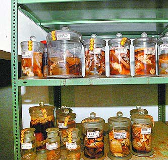 記者通過40米的通道,走到第二棟地勢較低的建筑內,記者攜帶探照燈,穿過一條白墻走道才轉彎進入一個房間,抬頭赫見整排約50罐尸罐,嚇得忍不住后退。原來4排鐵架上擺放裝有各種器官和尸塊的罐子,猶如一座人體器官博物館,令人全身起雞皮疙瘩。