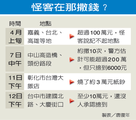 “鬼神啊,十萬(wàn),有夠沒?”撒錢怪客陳炳燈昨天在出租車上一路念念有詞,邊說(shuō)邊往車外撒錢,司機(jī)葉坤煌覺得不對(duì)勁,趁他不注意,向警方報(bào)案。