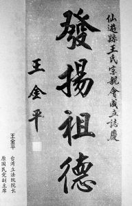 在日前舉行的仙游縣王氏文化研究會成立大會期間,仙游的王氏宗親們收到了來自臺灣王氏宗親王金平為王氏宗親會成立發來的賀呈。王金平的題詞是:發揚祖德。(如圖)