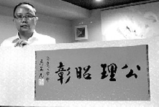 中新網4月21日電 廈門一位普通的律師張海鷹近日得到馬英九的親筆題詞。這幅題有“公理昭彰”四字的1米長卷是馬英九對張海鷹多年幫助臺商的謝禮。