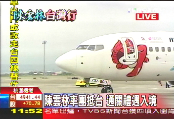 報(bào)道說,臺(tái)灣海基會(huì)副董事長(zhǎng)兼秘書長(zhǎng)高孔廉率領(lǐng)臺(tái)方的接待人員在停機(jī)坪接機(jī)。陳云林在機(jī)場(chǎng)禮遇通關(guān)直接驅(qū)車前往下榻的圓山飯店。