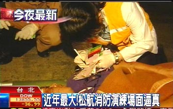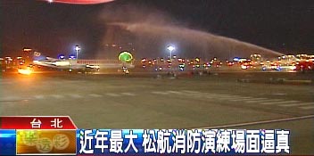 據臺灣TVBS報道,熊熊大火愈燒愈旺,松山機場火燒機,連行李都來不及拿,旅客倉皇逃命拔腿狂奔,連身穿像極了太空裝的消防隊員都出動,氣氛有夠緊張;不過,這其實只是松山機場難得的演習,但場面真的很盛大。