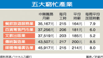 中新網11月5日電 根據1111人力銀行調查,扣除兼差等部分工時工作,臺灣有五大“窮忙”產業,分別為餐飲旅游娛樂業、百貨零售門市業、文教出版業、傳統制造業還有媒體廣告業。
