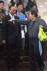 臺北“地方法院”27日審理前壹周刊記者臧家宜涉嫌恐嚇郭臺銘一案,在結(jié)束庭訊后,臧家宜父親臧景望(前右)當(dāng)面向郭臺銘嗆聲,表示郭臺銘曾恐嚇殺他全家。