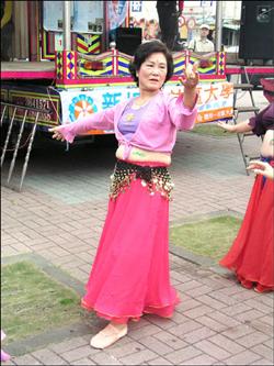 中新網1月7日電 臺灣72歲的阿嬤袁林秀鳳,昨天應邀到桃園縣楊梅火車站前大跳中東肚皮舞。她笑說,老公有交代,不能穿太露,但仍在肚皮上彩繪小紋身,這樣才漂亮。