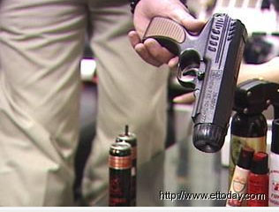 防身器材業者陳慈美表示:“這個叫做辣椒噴霧槍,它們噴出來的距離是5公尺到7公尺,噴出去的話是直線形,然后再擴散,有點淺咖啡跟辣椒那種紅色的顏色出來!