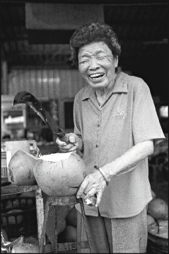 八十七歲的小桃阿嬤,至今仍靠賣椰子水維生,將在活動現場劈椰子。(圖:臺灣《聯合報》)