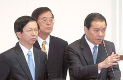 臺電董事會公股代表日前未能讓兩位副總經理人事案完成程序,引發“經濟部長”陳瑞隆﹙右﹚對臺電董事長陳貴明(左)不滿,指臺電執行力不足,公然抗命。(中國時報圖)
