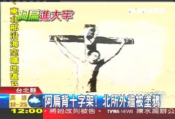 臺(tái)北看守所外面的墻上,被人畫了一幅陳水扁被釘在十字架上的涂鴉。圖片來源:臺(tái)灣TVBS