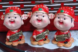 文財殿趁機也結合嘉義市正在舉行的國際管樂節,推出一套五尊的可愛財神爺祈福公仔。戴著財神帽的公仔,頭部可以靈活晃動,手上則是拿著法國號、薩克斯風等樂器,造型極為逗趣。