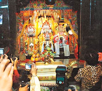 暌違一甲子,新港媽祖(右)4日終和北港媽祖同殿安座,信眾爭相拍下歷史一刻。圖片來源:臺灣《聯合報》