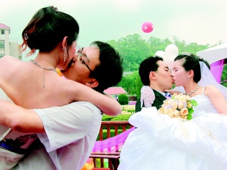 婚禮結束后舉辦趣味比賽,新郎抱起新娘親吻比久,原先取前三名,結果十多對都通過“考驗”,通通有獎,他們說:“她不重,她是我老婆!”
