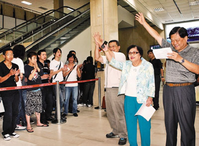 綜合臺灣媒體報道,范振宗、許榮淑19日中午自大陸返臺,當兩人步進入境大廳,立即響起熱烈掌聲、歡呼聲,民進黨黨員帶頭高呼:“用最熱烈的掌聲,歡迎我們臺灣阿嬤,許榮淑!”二人在機場獲得大批支持者聲援,只是仔細一看,這些支持者年紀輕、身上還有刺青,跟香港電影里的“古惑仔”很神似。