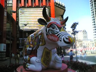 今年生肖牛年,搭配牛年,臺(tái)北市文化局協(xié)辦的“2009臺(tái)北奔牛節(jié)、奔牛入市、放養(yǎng) ”活動(dòng).由兩只牛拼奏成一頭奔跑的牛藝術(shù),另外全世界最大的牛,長(zhǎng)、高四米六、兩米五,則現(xiàn)身在信義商圈,藝術(shù)家創(chuàng)作的主軸為平安牛,上頭畫(huà)滿臺(tái)灣傳統(tǒng)的民俗圖騰。國(guó)際文創(chuàng)執(zhí)行長(zhǎng)陳秉鴻表示,臺(tái)北市是全世界第六十五個(gè)城市舉辦奔牛節(jié)活動(dòng),為了凸顯臺(tái)灣文化,臺(tái)北奔牛節(jié)充滿亞洲創(chuàng)意元素。