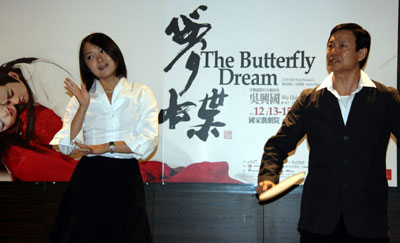 中新網(wǎng)11月2日電 據(jù)“中央社”報(bào)道,臺(tái)灣當(dāng)代傳奇劇場新創(chuàng)昆曲風(fēng)歌劇《夢蝶》十二月十三至十六日將在戲劇院演出。在昨天的記者會(huì)中,作為男女主角的京劇名角吳興國(右)與昆曲名伶錢熠(左)現(xiàn)場表演一段“搧墳女與莊周”。