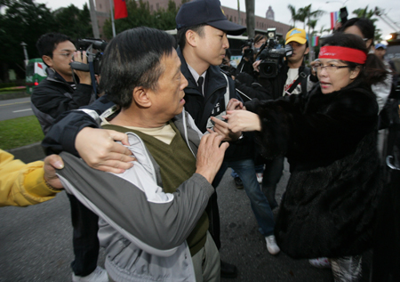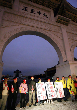 臺北中正紀念堂前的“大中至正”牌匾即將拆除,紅衫軍“自主公民協會”成員六日熬夜守護牌匾,抗議臺當局拆除古跡。有路過的綠營支持者罵三字經,引發沖突,隨即被警方帶走,避免紛爭。“中央社”圖 張皓安 攝