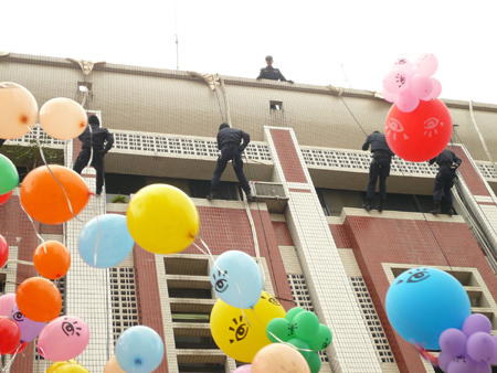 臺(tái)灣屏東地檢署十八日舉辦反賄選的造勢(shì)宣傳,以背十字架和套枷鎖提醒候選人賄選“遺臭萬(wàn)年,活罪難逃”。還有霹靂小組在“鐘馗的法眼”氣球群中垂吊而下,象征檢警調(diào)布滿(mǎn)天羅地網(wǎng),法眼難逃。“中央社”圖 郭芷瑄 攝