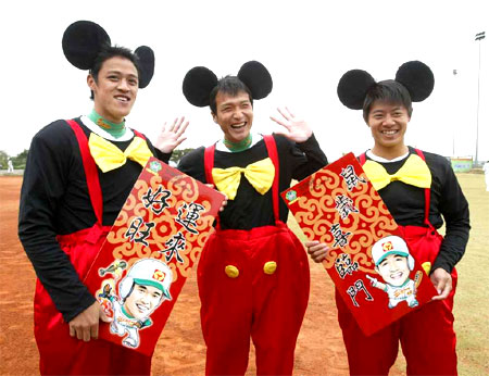 臺灣職業棒球明星投手(右起)林其緯、蔡明晉、沈福仁,十六日在球場春訓開訓典禮中,搞笑巧扮米老鼠,向球迷拜早年,并期許球隊鼠年再創巔峰。臺灣《中國時報》圖 蔡明德 攝