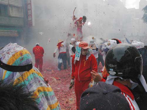臺灣臺東元宵節重頭戲“炮炸寒單爺”二月二十一日下午登場,肉身寒單爺穿著短褲、手持榕樹葉接受鞭炮轟炸,民眾全副武裝感受震撼的場面。(“中央社”圖)