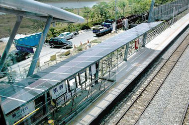 4月22日是世界地球日,臺南縣環(huán)保局及縣府工務處22日聯合在南科車站宣導綠能科技,臺南縣長蘇煥智說,臺鐵南科站六月底啟用,除太陽能發(fā)電具有綠色科技概念,因為車站通車,通勤族可利用大眾運輸系統(tǒng)到南科園區(qū)各廠上班,先搭火車到南科站,再搭園區(qū)接駁車,更能有效節(jié)能減碳。