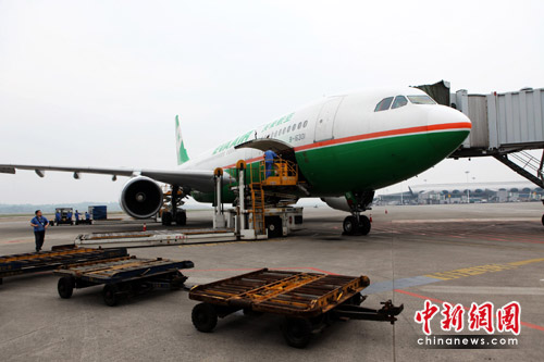 中新網(wǎng)重慶5月26日電 (記者 郭晉嘉)隨著富士康、英業(yè)達(dá)等臺企入駐重慶,今年以來渝臺直航航線客運(yùn)持續(xù)火爆,貨運(yùn)開始升溫。5月26日,臺灣立榮航空的B7192航班由麥道90機(jī)型改為252座的空客330機(jī)型執(zhí)飛,這是重慶—臺灣航線首次采用大型寬體機(jī),也是首次大批運(yùn)送貨物。