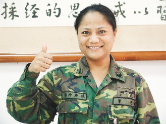 38歲陳梅珍從小想當(dāng)護(hù)士,中學(xué)畢業(yè)考上護(hù)專,但學(xué)費(fèi)貴,家里無力負(fù)擔(dān)。念完高中后,為減輕父母負(fù)擔(dān),入伍成為臺軍首批志愿役女士官。現(xiàn)在是陸軍空降訓(xùn)練中心士官長,去年協(xié)助訓(xùn)練連上人員,獲得“莒光連隊(duì)”殊榮。