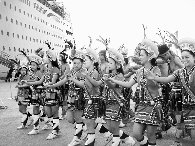 13日,安利團員乘坐的郵輪停靠花蓮港口。早晨7時,已經(jīng)有花蓮原住民阿美族的姑娘小伙身著盛裝,在港口用歌聲和舞蹈歡迎大陸來的客人。