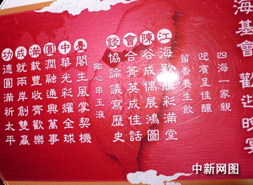 海基會為晚宴特制一份“藏頭詩”菜單:“江海歡騰彩滿堂/陳谷成偶展鴻圖/會合精英成佳話/談協論議寫歷史/臺閣生風掌契機/中華光彩耀全球/圓潤融通興萬事/滿載豐收齊歡樂/成就兩岸創雙贏/功德圓滿祈太平”,以每句詩的頭一個字組成“江陳會談.臺中圓滿成功”。