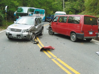 領隊邊雯雯和多名團員提說,車子開到下山右彎道時,對向車道突有輛休旅車想超過游覽車,開到他們的車道上,兩車都急忙轉向,他們搭的小巴車頭往左轉向,還是和休旅車的左側車頭擦撞;同團第二輛小巴煞車不及,追撞到第一輛小巴,造成第一輛小巴的8名游客,第二輛的2名游客受傷。