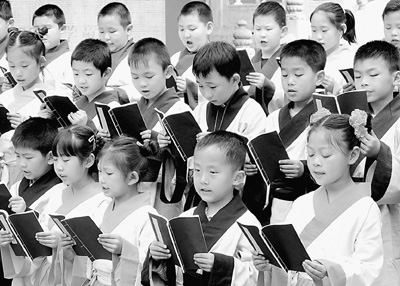 60位身著古代學生服的學童,齊聲誦讀《弟子規》;大陸絲竹名家塤琴合奏《幽蘭操》。朗朗童聲,悠悠古樂,回蕩在古樹參天、屋宇儼然的孔廟。