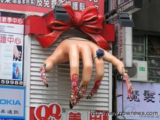 中新網(wǎng)6月23日電 據(jù)臺灣“今日新聞”報道,桃園市某家美甲業(yè)者招牌頗具創(chuàng)意,一只巨大的左手正高高掛在店門之上,還特別做個蝴蝶結(jié),宛如天上掉下來的禮物,每當(dāng)民眾經(jīng)過此店,總是會留意一下如同仙女般的左手。
