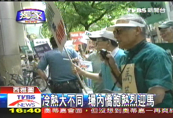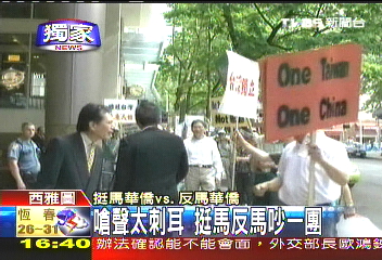 而飯店里的挺馬僑胞也不停在喊支持口號,才讓馬英九開心地笑了,挺馬僑胞的歡呼聲一時間蓋過了場外的嗆聲。而反馬僑胞仍舊拼命表演,手上高舉“ONE TAIWAN ONE CHINA”的“臺獨”標(biāo)語,徹底惹毛了飯店2樓的挺馬僑胞,忍不住沖下了樓,戰(zhàn)火一觸即發(fā)。