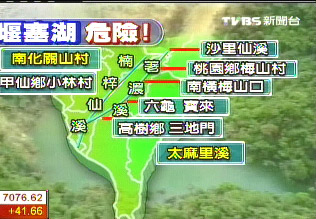 光是高屏溪上游就有8個堰塞湖潰堤,影響地區(qū)包括梅山、六龜、寶來、高樹、三地門、小林村等,至于南化關(guān)山村和臺東的太麻里溪則是拉警報。