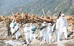 中新網8月20日電 臺軍部隊以及相關搜救人員連日來持續在高雄縣小林村等重災區陸續搜索罹難者遺體,當地發現30幾處地面滲出血水,19日,搜救人員發現部分尸塊,推測是媽媽抱著小兒子逃命,卻不幸被傾流而下的巨大土石流掩滅。消息傳出,村人不勝唏噓。