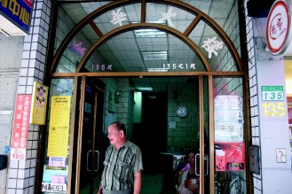 羅斯福路三段一棟大樓27日遭人將各樓層電梯按鈕與大門門鎖涂滿三秒膠,一名婦人抱著小孩不方便爬樓梯,只好在樓下等。圖片來源:臺灣《聯合報》