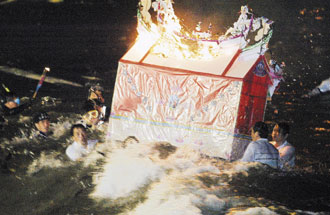 到了午夜,各宗親會人員移師到望海巷海岸。道長主持祭拜儀式后,各宗親會點燃水燈頭的銀紙,再將水燈頭推向海面。水燈頭在暗夜中散發火光,在海面漂流,讓陰間好兄弟感受到暖意。